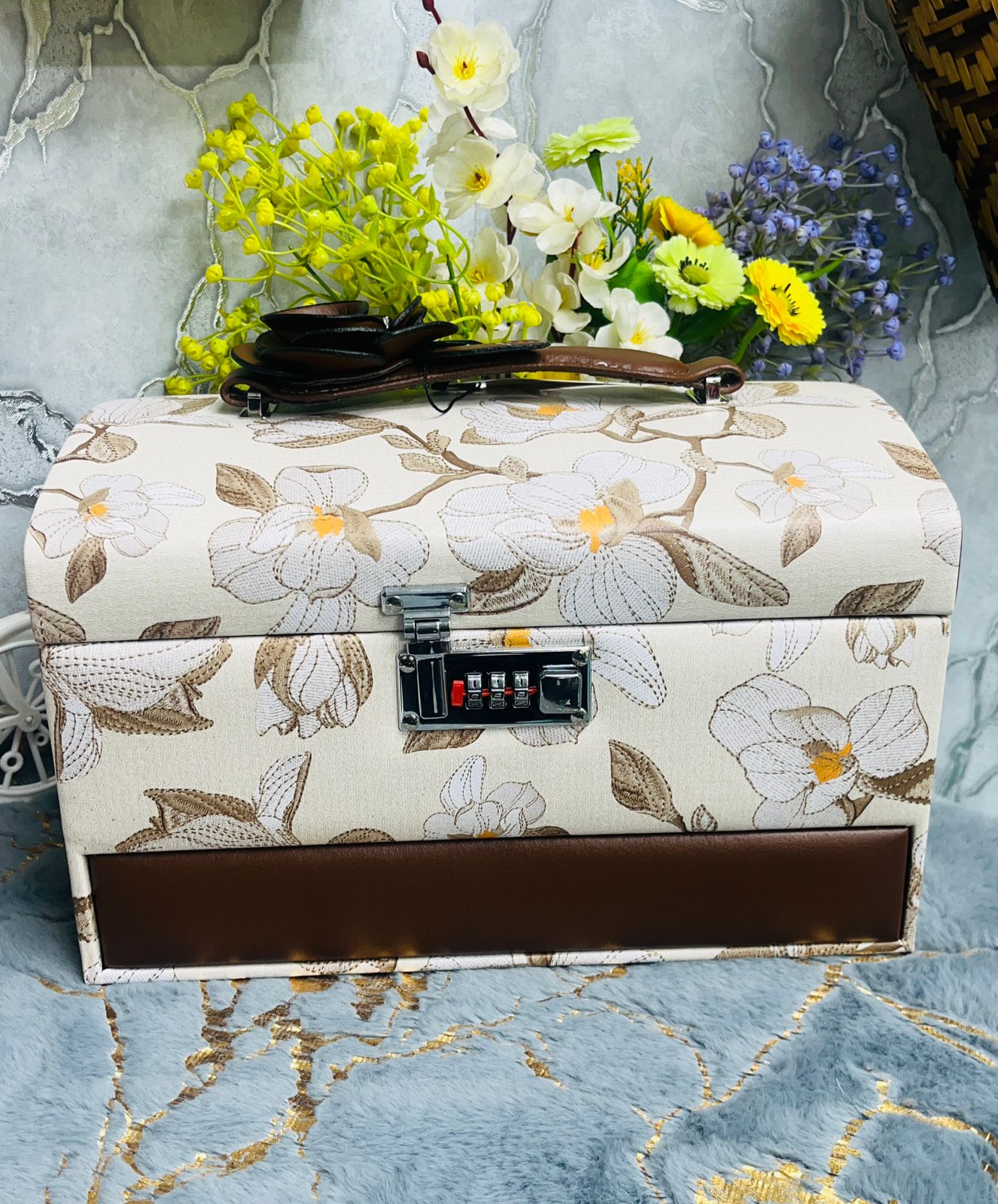 Each box features a delicate, embroidered-style floral motif on a high-quality fabric exterior, accented by a sleek vegan leather trim. Designed for the woman who values both style and safety, it comes equipped with a heavy-duty combination lock to keep your most precious items secure. Whether you choose the romantic blush pink, the serene sky blue, or the sophisticated charcoal grey, this organizer brings a touch of "boutique luxury" to your daily routine.