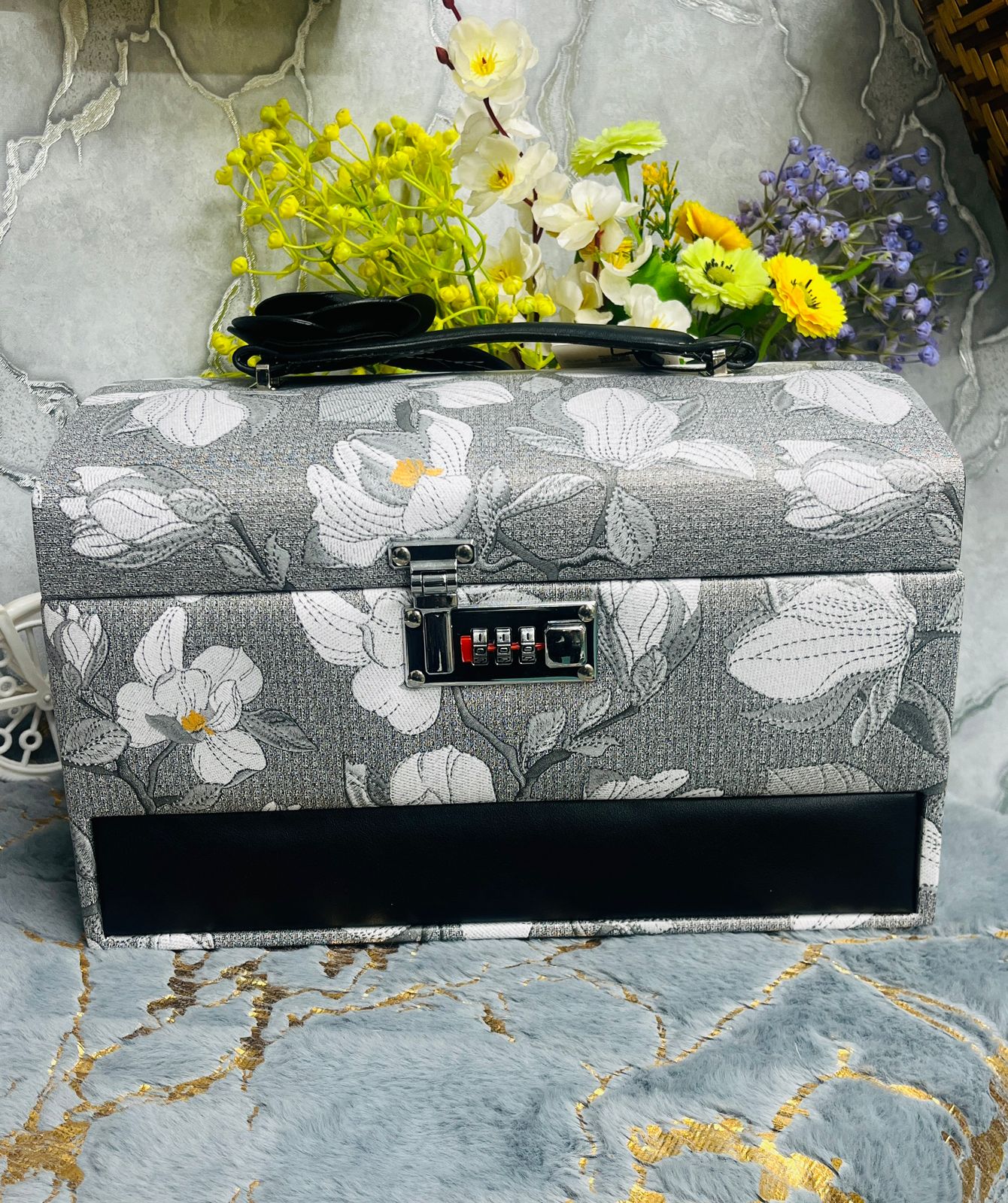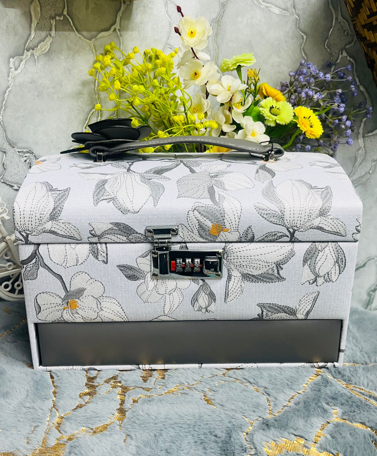 Each box features a delicate, embroidered-style floral motif on a high-quality fabric exterior, accented by a sleek vegan leather trim. Designed for the woman who values both style and safety, it comes equipped with a heavy-duty combination lock to keep your most precious items secure. Whether you choose the romantic blush pink, the serene sky blue, or the sophisticated charcoal grey, this organizer brings a touch of "boutique luxury" to your daily routine.